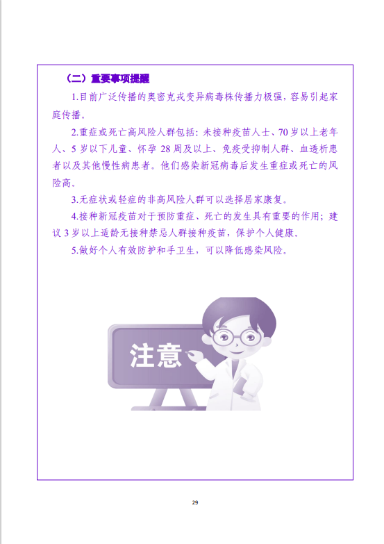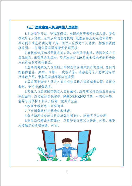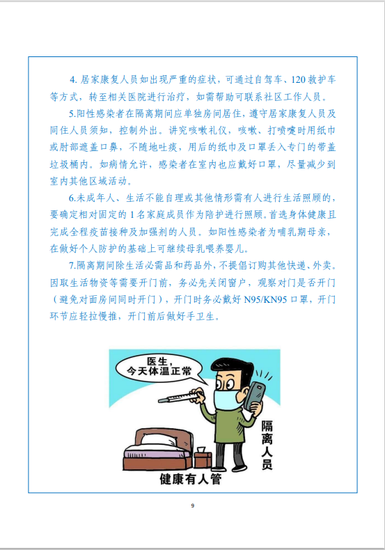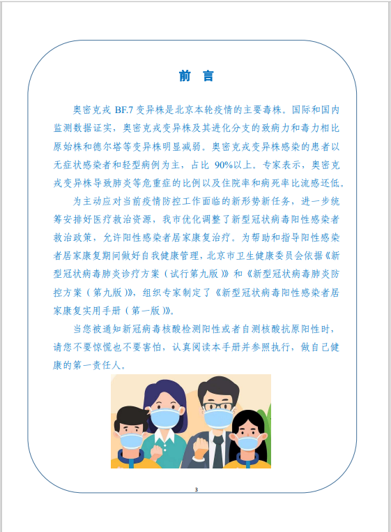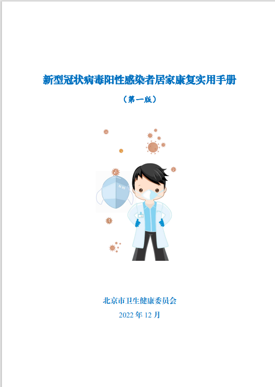 为帮助和指导阳性感染者居家康复期间做好自我健康管理,北京市卫生健康委员会依据《新型冠状病毒肺炎诊疗方案(试行第九版)》和《新型冠状病毒肺炎防控方案(第九版)》,组织专家制定了《新型冠状病毒阳性感染者居家康复实用手册(第一版)》。