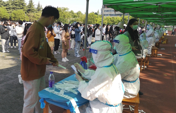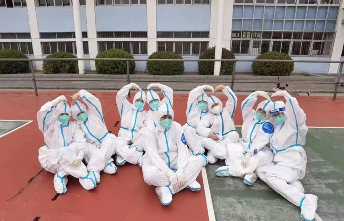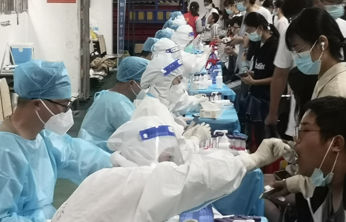 4月21日凌晨2时25分,合肥市疫情防控应急指挥部发布通告,在蜀山区、经开区、高新区开展核酸检测。校医院负责人第一时间在群里通知,并启动应急程序。6时40分,校医院全体成员完成集结,全部到达采样台,他们有的刚下夜班,有的正在上夜班,接到命令后他们没有半句怨言,放下手中所有的事情迅速集结完毕,穿好防护服准备开始采样……这些熟悉的工作今天变成全新的挑战,因为他们要面对的是全员全天候核酸检测。