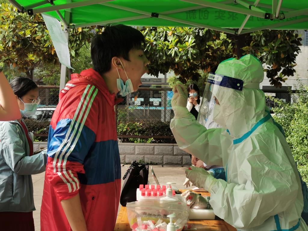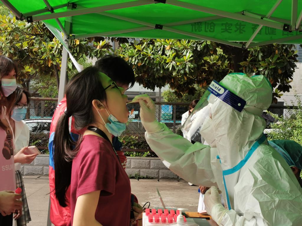 下午两点半取样工作有条不紊地展开。校医院工作人员维持队伍秩序,讲解注意事项,安抚师生情绪,做好物资保障 ;师生们积极配合,佩戴口罩,保持间距,有序排队。