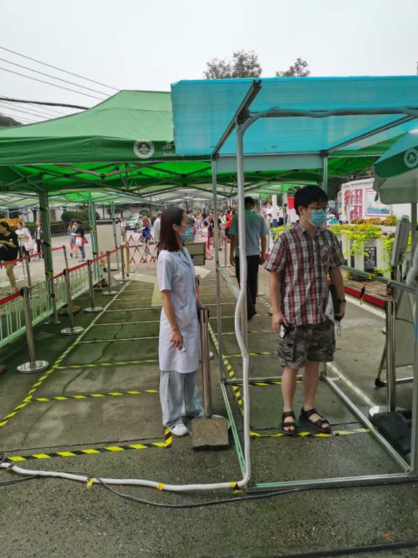 1、考生进校门时的体温检测:在学校东门设立的考生通道中负责进校考生的体温检测。