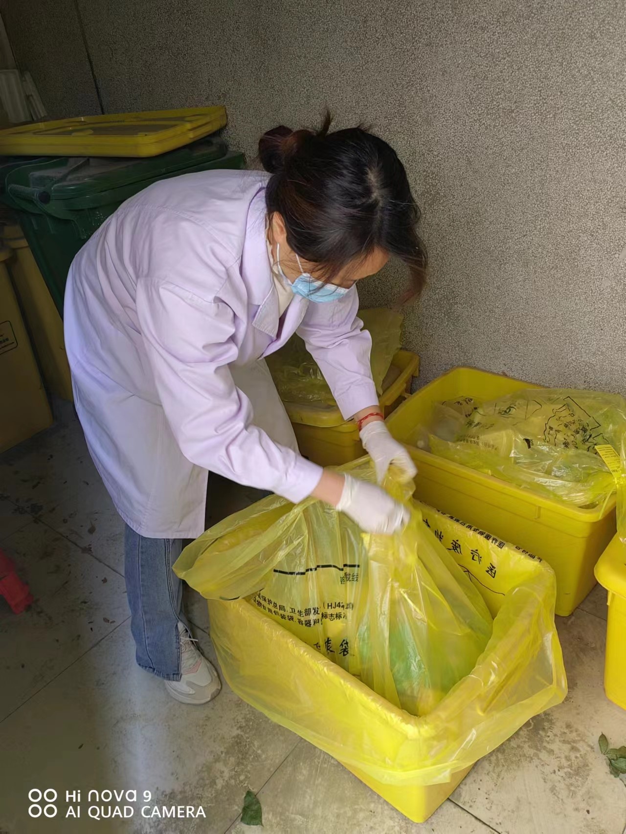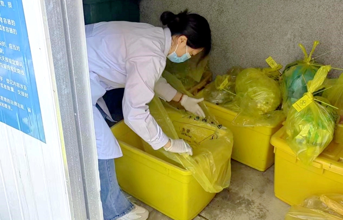 本网讯 2023年4月26日,校医院换药室护士高加敏在整理、打包医疗垃圾。