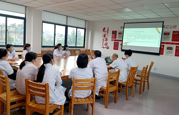 何医生围绕消化性溃疡的病因、临床表现、检查、诊断、鉴别诊断、治疗、预防保健等方面全面系统地进行讲解。他指出:消化性溃疡属于心身疾病的范畴,在治疗过程中,我们要做到双管齐下,在原发病躯体治疗的同时兼顾心理、行为等方面的治疗;此外消化性溃疡重在预防,在日常饮食上要做到“有粗有细、不甜不咸、三四五顿、七八分饱” 。主讲结束后,大家积极响应,踊跃发言,针对临床诊疗中遇到的典型病例、诊疗经验、医患关系的处理等方面进行交流学习。