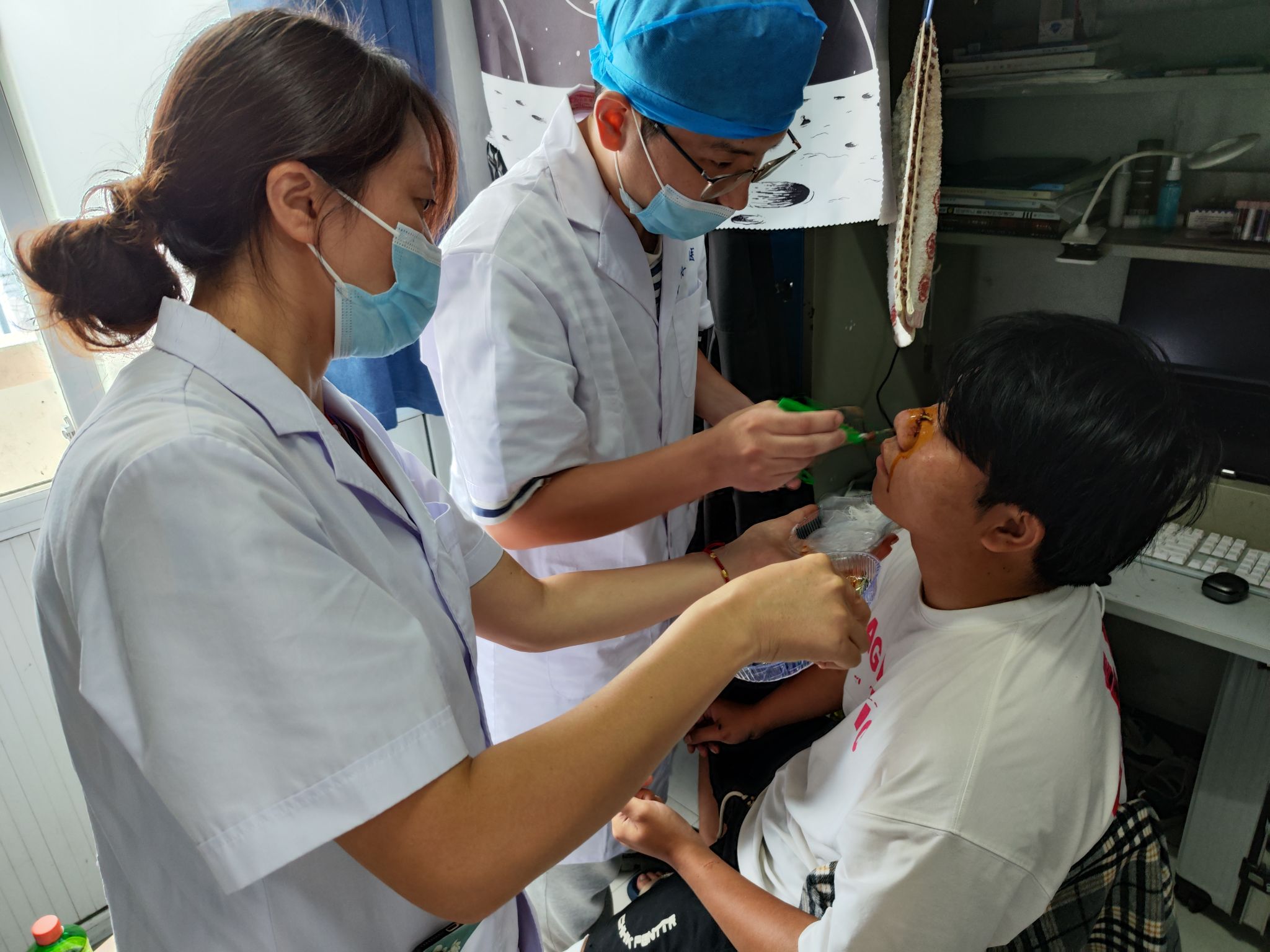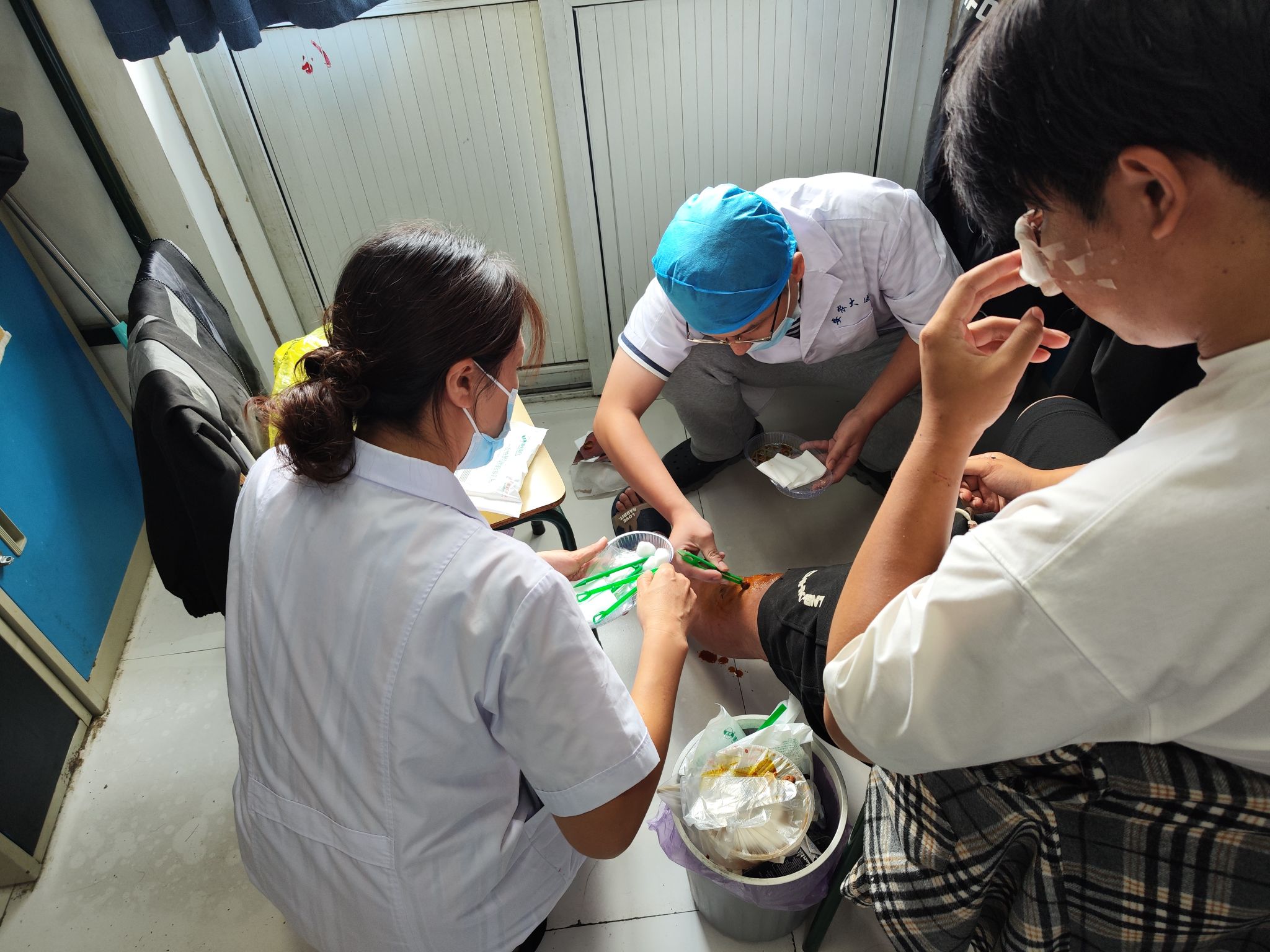9月7日下午,校医院接到电话得知大学生公寓楼5楼有位多处外伤的学生需要清创处理。由于该生腿部受伤严重,行动不便,校医院外科医师王琛和换药室主管护师高加敏带上药箱,为该生进行清创换药。