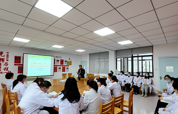 首先夏业鲍副部长为校医院全体医务人员作了题为“践行医者仁心精神,尽职尽责全力服务学校高质量发展”的报告。夏部长首先指出我们所面临的形势与机缘:“我们赶上了好时代/时期,我们来到了好地方/学校;我们抓住了好机遇/机缘,我们遇见了好战友/团队…”。他结合医药行业不正之风的案例告诫我们:无论“沉疴顽疾”,还是“疑难杂症”,医疗腐败的病症该治就得治,容不得拖延。一个健康的就医环境,守护的是大众身心健康,也是在守护可贵的医者仁心。他强调:新征程,医务工作者要践行医者仁心,世间术业有几何,至精首善为医者。我们要“修医德”,医德医风见于心,至善至诚践于行;“讲廉洁”,树清正廉洁之风,惟律己者而自省;“行仁术”,怀仁爱之心修身,循患者利益至上。以至“精”的医术和至“诚”的医德,奉行“仁爱之心”的准则,遵循病人利益至上的基本原则,弘扬人道主义的职业精神,恪守预防为主和救死扶伤的社会责任。同时他对大家也作了以下八项要求:认识一个规律、保持两种状态、摆正三个关系、接受四种考验、具备五种素养、练好六种功夫、要有七种意识、克服八种不足,以保障我校师生健康为出发点,牢记初心使命、坚定理想信念,勇于担当、甘于奉献,奋力推动学校高质量发展。