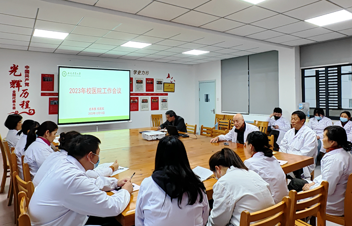 2023年12月13日下午15:00,总务部校医院在校医院四楼会议室召开全体医务人员会议,会议由校医院洪涛院长主持。