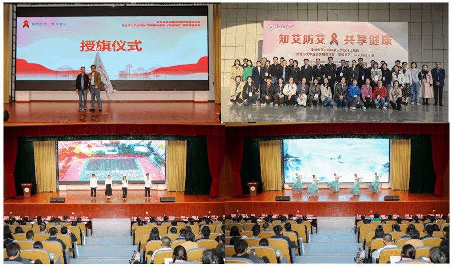 孟庆联为高校代表单位授旗。青年大学生代表宣读了“知艾防艾 共享健康”倡议书,展演了舞蹈和《青春足印》歌曲。张进为同学们做“远离艾滋,绽放多彩青春”为主题的防艾知识科普讲座,并开展防艾知识互动竞答,同学们踊跃积极举手参加答题,合肥市疾控中心艾防科姚晖、合肥市蜀山区疾控中心艾防科李承铖分别为同学们进行专业点评和细致的解读。同时,校医院设立防艾知识宣教台,医护人员为同学们解答防艾相关问题,发放防艾知识宣传册页1000多份。
