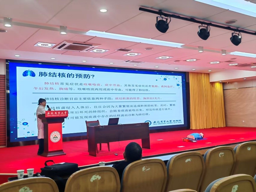 彭鹏讲解了结核病的概念、传播途径、临床表现、诊断与治疗以及常规的预防措施等重点内容。提醒同学们要树立“早发现、早诊断、早治疗”的理念,加强自我健康管理,养成良好的作息与体育锻炼习惯,提升身体综合素养,共建“无结核校园”、健康校园。