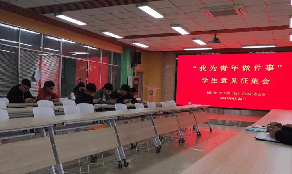 学党史,办实事。面对面,解难题。4月22日校团委、学工部(处)、信息化办公室、后勤保障处联合在欣院食堂三楼会议室召开“我为青年做件事”学生意见征集会。各部门领导、相关工作人员和二十一位来自各学院(学部)的学生代表参加了此次会议。