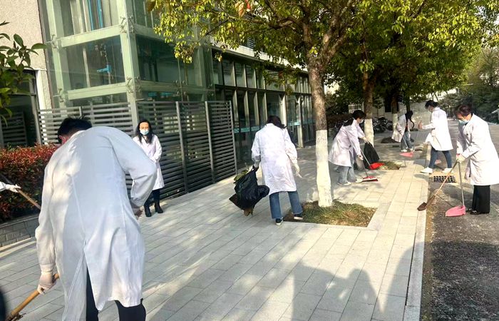 校医院党支部带领职工对校医院周边的每个角落,用扫帚清扫路面落叶,清理拐角、水沟里的废纸、塑料袋。经过大家的努力,校医院周边被清理的干干净净,主干道干净整洁,工作环境焕然一新。