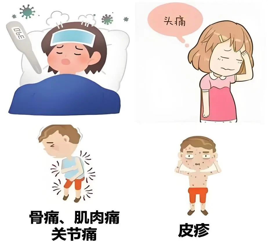 患者会出现高热,并有“三红”(面部、颈部、胸部呈现潮红)、“三痛”(头痛、眼眶痛、全身肌肉及骨关节痛)症状,身上出现皮疹。