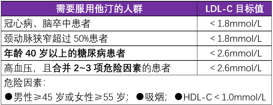 凡是低密度脂蛋白胆固醇(LDL-C)水平超过目标值的人群,若无禁忌症和可耐受,都应该服用他汀类药物(见下表)。