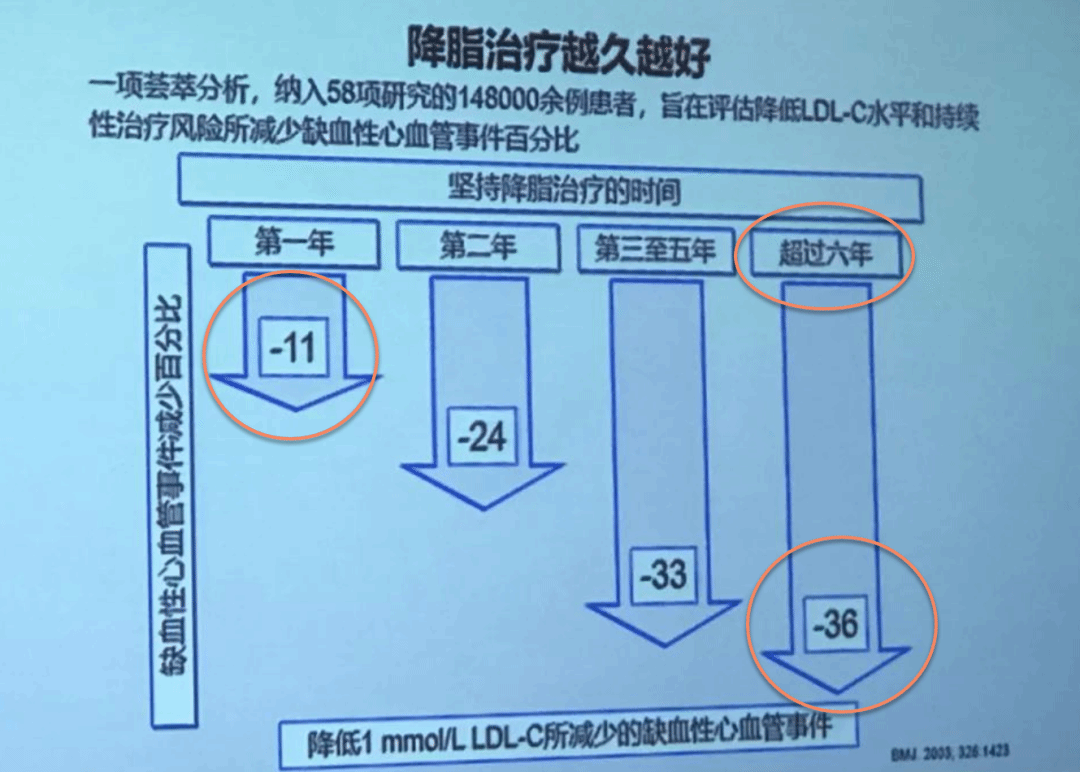 一项荟萃分析发现,坚持服用降脂药物1年后,LDL-C每降低1mmol/L,发生缺血性心血管事件风险降低11%,2年后降低24%,超过6年降低36%。